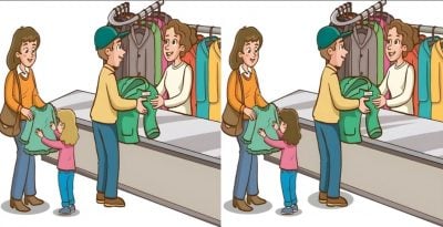 Pronto para o próximo desafio? Veja d fotografias de uma loja de roupa onde uma família está a comprar roupa. À primeira vista, as imagens parecem igs, mas olha com atenção. Há três pequenas diferenças. Achas que consegues encontrá-las todas em apenas 25 segundos? Vamos ver se és muito perspicaz!