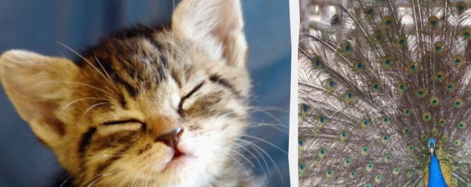 O gatinho estava atrás da cauda do pavão / colagem da foto Moje